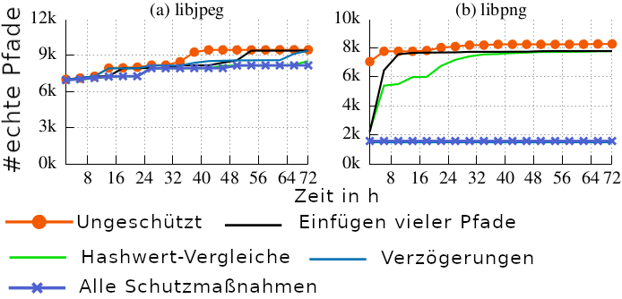 strcpy(strA, "if(strcmp(strB,strA))");Es ist also möglich, dass durch eine bessere Implementierung zu deutlicheren Ergebnissen in der Auswertung der AntiHybrid-Technik geführt hätte. Zusammen mit der Abhängigkeit von guten Testfällen ist Fuzzification insgesamt nicht breit als Fuzzing-Schutzmaßnahme anwendbar. Die Evaluation in (Jung et al. 2019b) mit AFL-QEMU zeigt auch, dass Fuzzification nicht gegen jedes der getesteten Programme die Anzahl der gefundenen Pfade reduzieren konnte. In Abbildung 1 ist zu sehen, dass Fuzzification (alle Schutzmaßnahmen aktiviert) bei libpng erfolgreich ist (gefundene Pfade um ca. 77% reduziert), bei libjpeg hingegen nicht (gefundene Pfade um ca. 11% reduziert). Eine von Wang et al. (Wang et al. 2020) durchgeführte Evaluation von Fuzzification unter gleichen Bedingungen, misst außerdem deutlich abweichende Werte für objdump. (Jung et al. 2019b) misst eine Reduktion der Pfade um ca. 80%, (Wang et al. 2020) hingegen eine Reduktion um nur 7,6%.